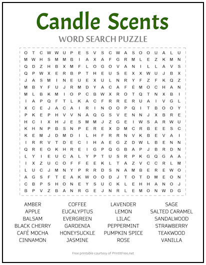 If scented candles are your thing, then get a whiff of this free printable word search featuring a whole host of memorable candle scents such as eucalyptus, gardenia, honeysuckle, black cherry, and more.